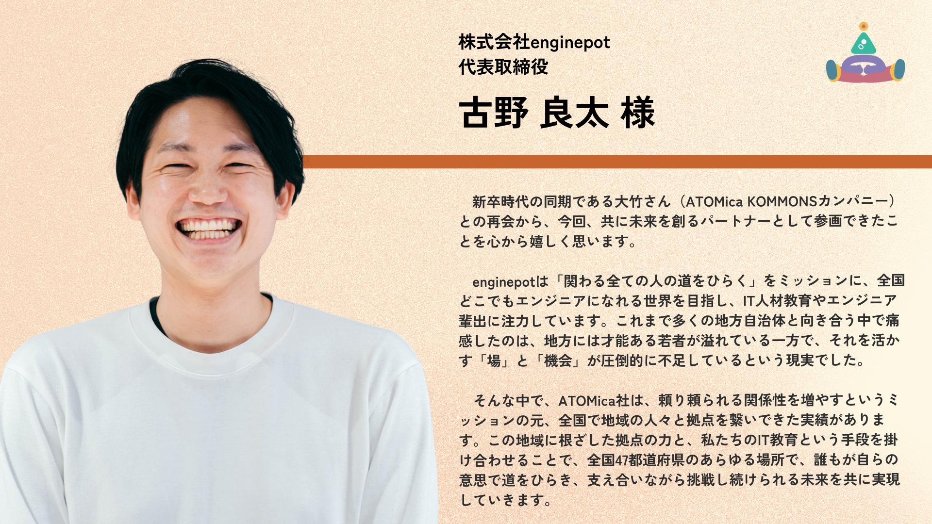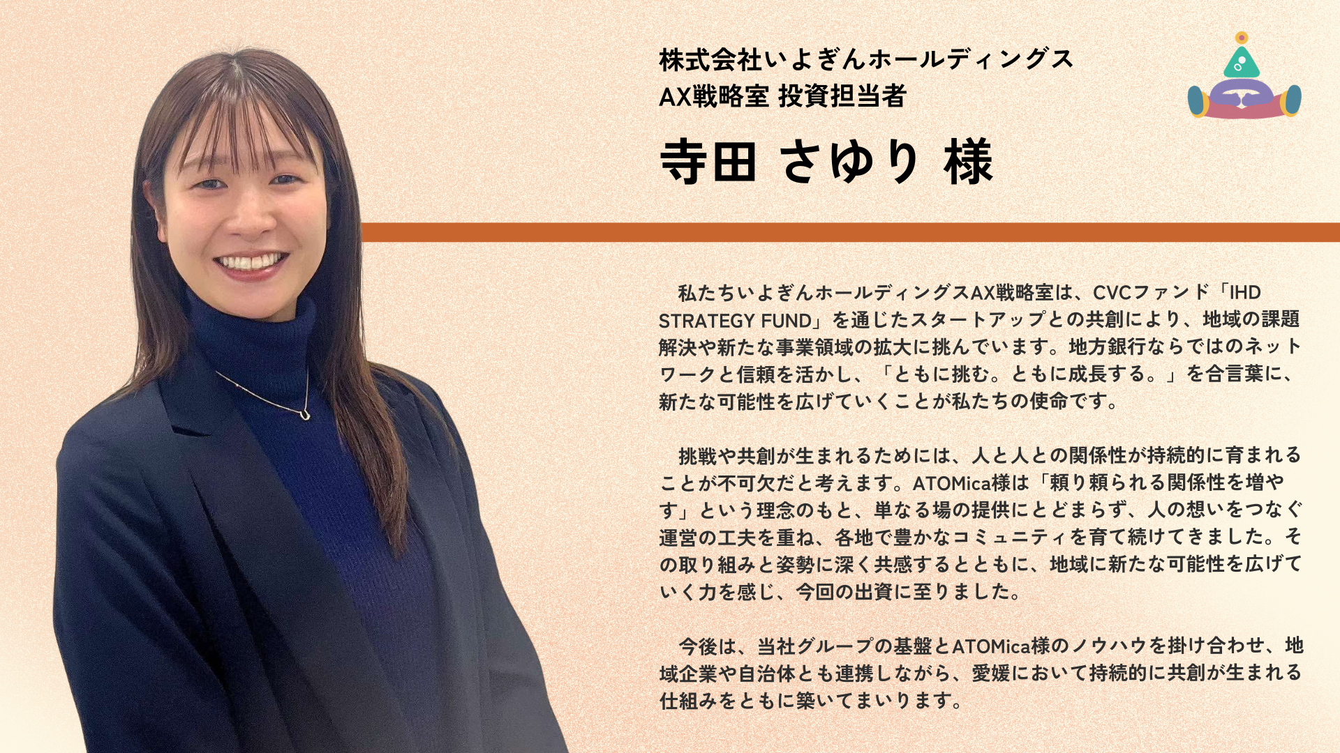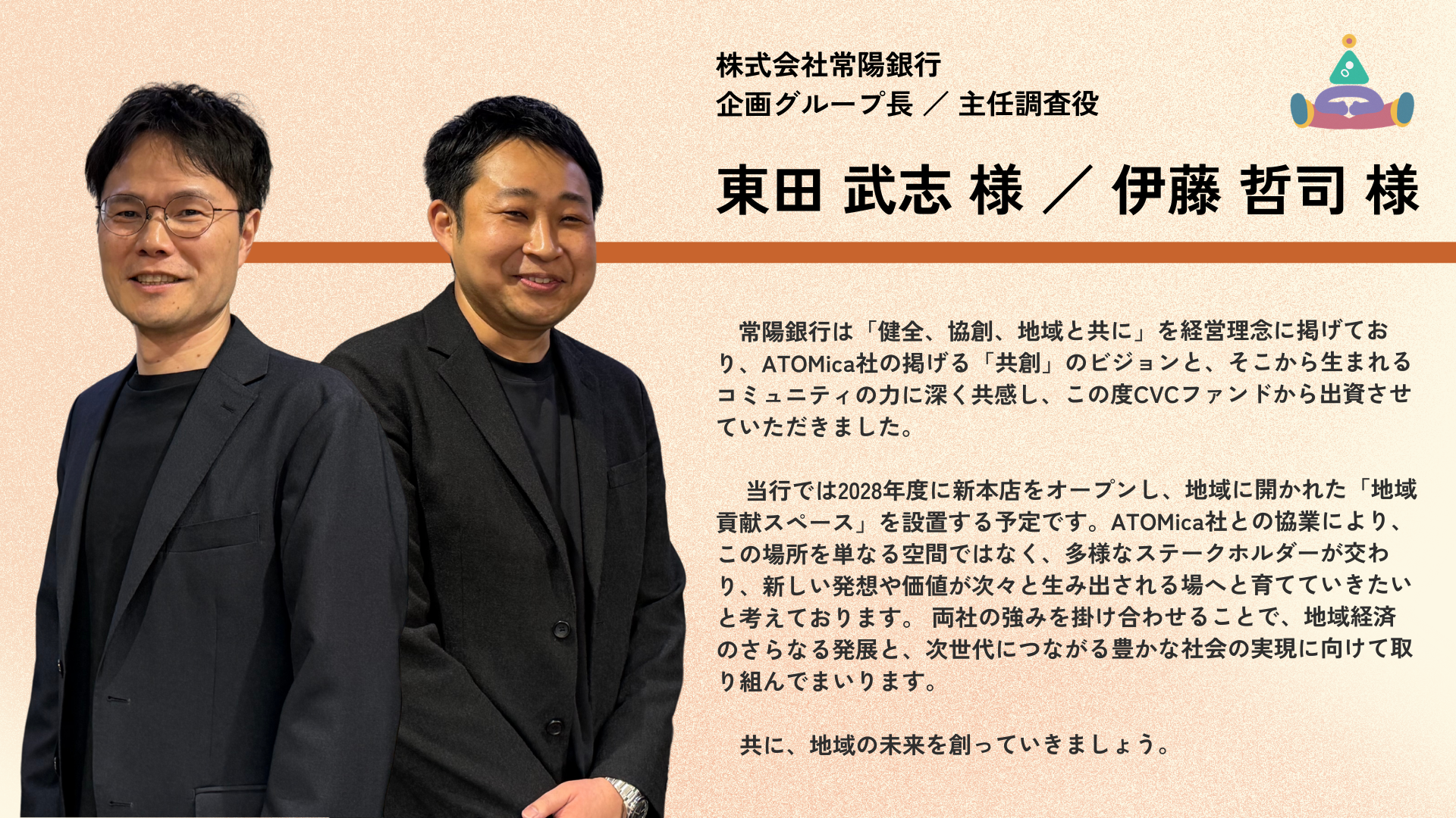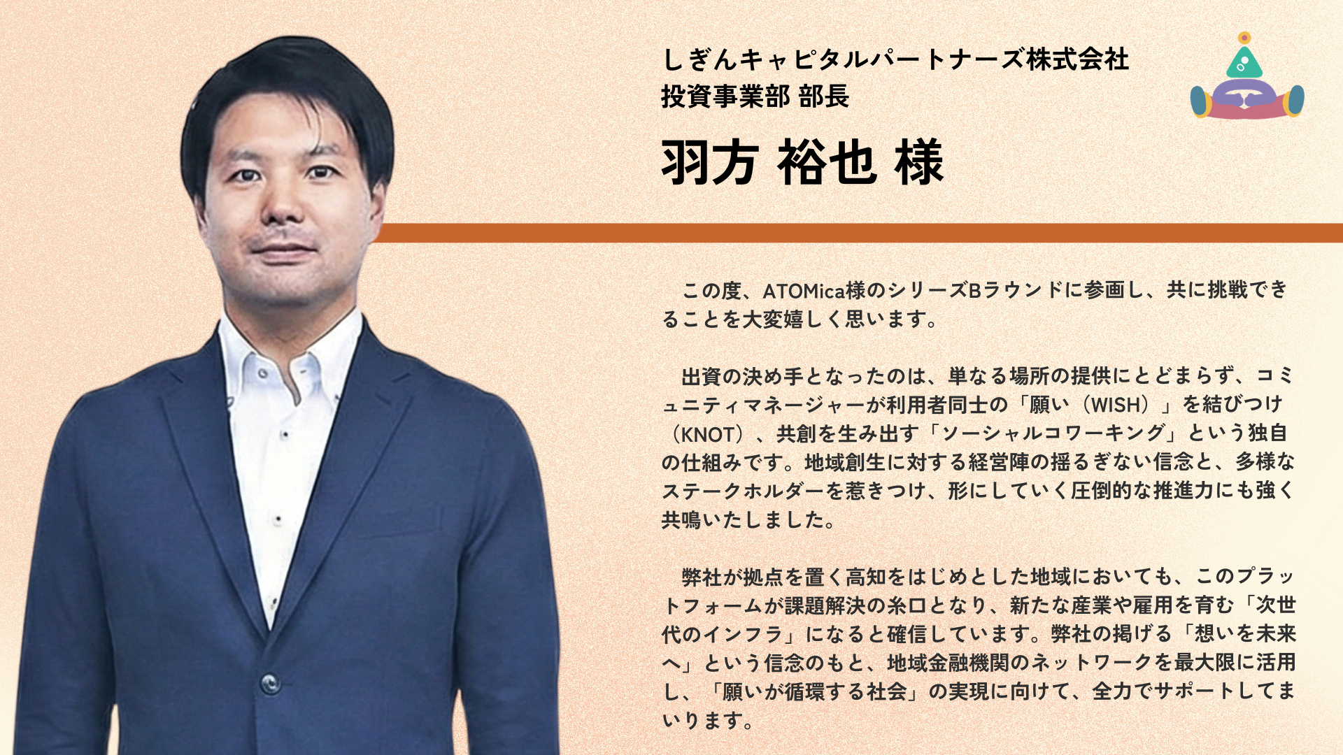 株式会社ATOMica(本社:宮崎県宮崎市、代表取締役Co-CEO:嶋田瑞生・南原一輝、以下「ATOMica」)は、シリーズBラウンドのファイナルクローズを完了したことをお知らせいたします。2025年6月の1stクローズ、同年7月の2ndクローズに続き、今回新たに11社の新規株主のみなさまを迎え、本ラウンド総額は5.7億円、増資を通じた累計資金調達額は19億円となりました。