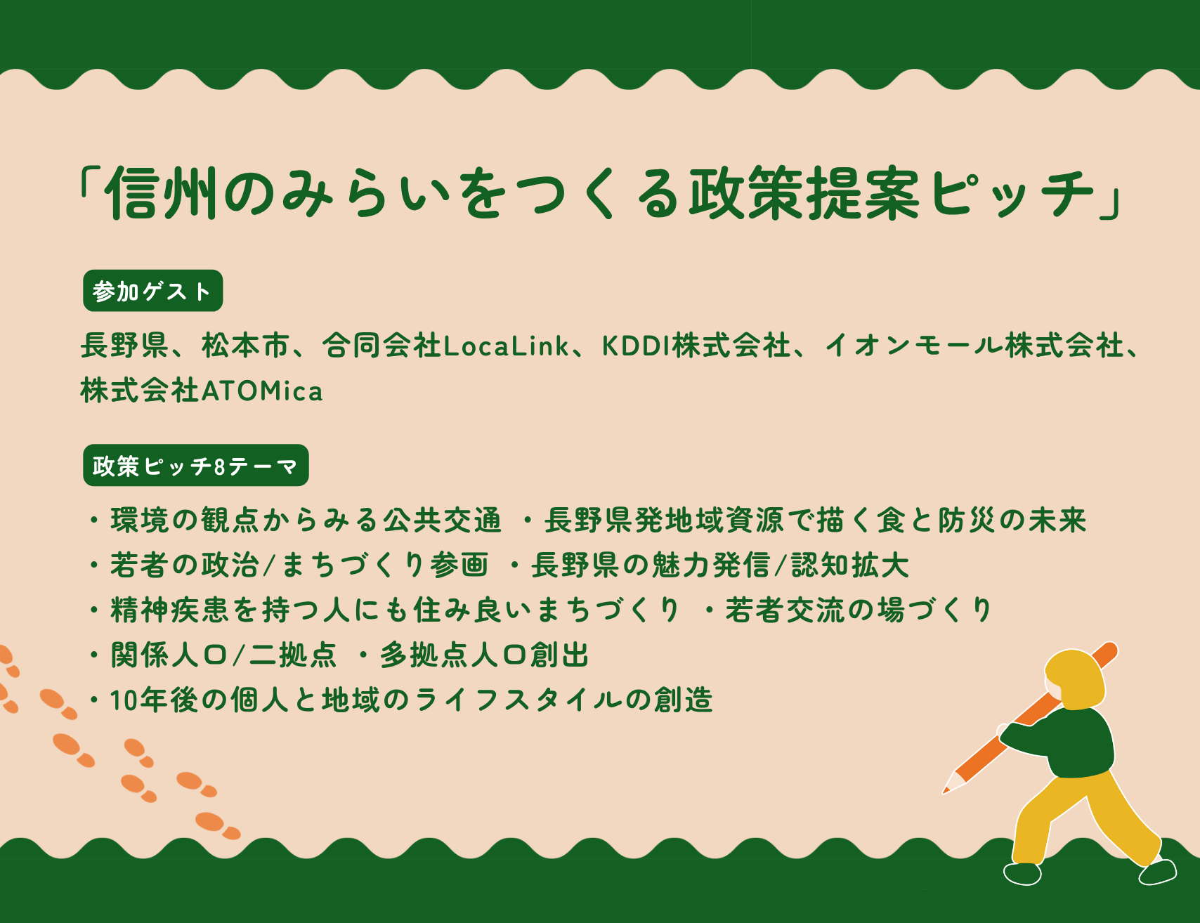 当日は、阿部長野県知事と若者代表によるディスカッション、臥雲松本市長・北九州市Z世代課 課長・若手起業家によるトークセッションに加え、若者自身が政策を提案するピッチの開催や、関連イベントブースの設置を予定しています。
