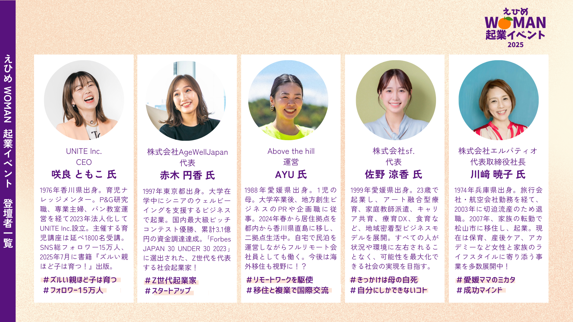 「えひめWOMAN起業イベント2025」に登壇するのは、東京で活躍する2名の女性起業家と、地元四国で活躍する3名の女性起業家です。イベントは全日程、トークセッションとグループワークの二部制で、ファシリテーターは、株式会社ATOMica ママオアシス事業 代表 檜垣葵が務めます。