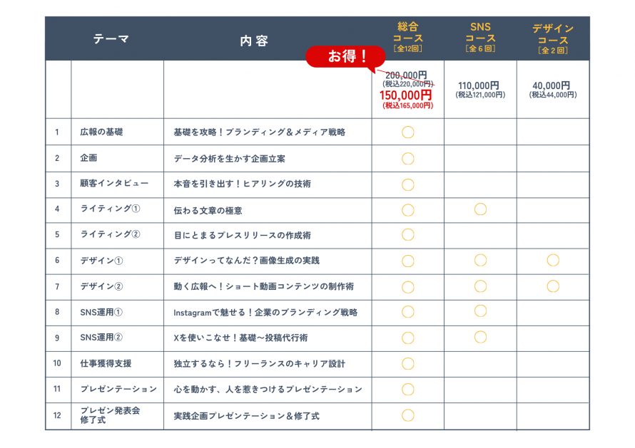 - 受講費: 総合コース150,000円/SNSコース110,000円/デザインコース40,000円 税抜